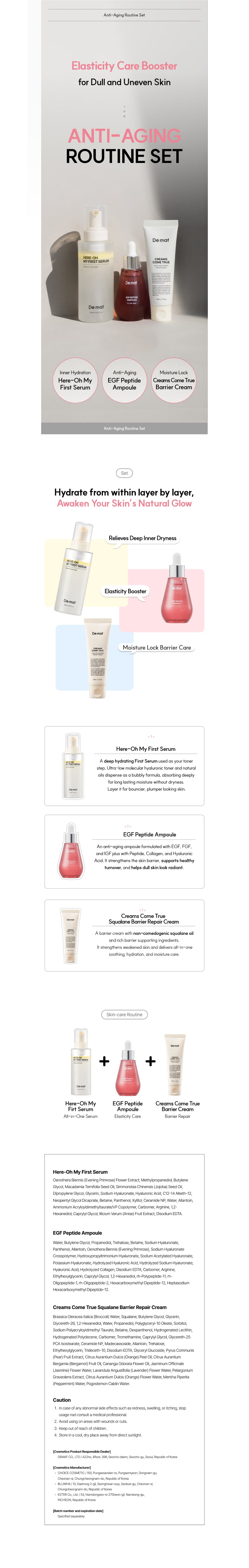 EGF, FGF, and peptide complexes help boost renewal and elasticity for firmer, more radiant skin. Low molecular hyaluronic acid, collagen, and squalane deliver deep hydration and a plumping effect, while ceramide, panthenol, and evening primrose extract strengthen the skin barrier. This dermatologist tested, fragrance free routine targets early fine lines and texture with a soft, lightweight finish for all skin types.